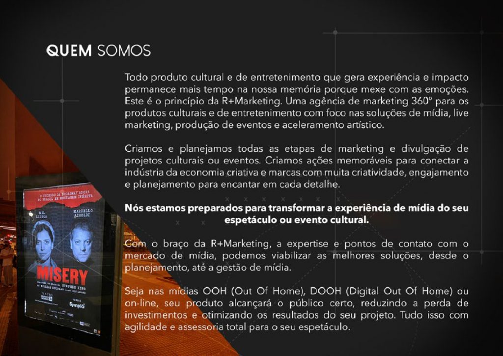 Todo produto cultural e entretenimento que gera experiência e impacto permanece mais tempo na nossa memória porque mexe com as emoções. Este é o princípio da R+Marketing e do nosso negócio. Uma agência de marketing 360º, para os produtos culturais e entretenimento com um ponto focal nas soluções de mídia, marketing cultural, produção de eventos e aceleramento artístico.