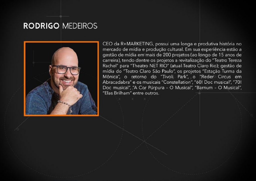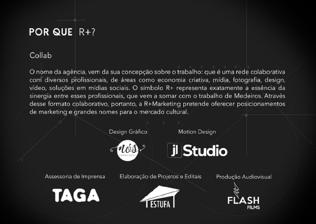 Voltada ao mercado de cultura e do entretenimento, a agência R+ Marketing criada originalmente em 2009 por Rodrigo Medeiros, um dos mais consolidados especialista em Mídia e Marketing Cultural tendo participado de mais de 200 projetos. Como principais clientes atualmente incluem varias produtoras culturais e marcas do segmento da economia criativa, destaque para WB PRODUÇÕES, ATUAL PRODUÇÕES, PALCO 7, TURBILHÃO DE IDEIAS, REGA INÍCIO, BUCKER PRODUÇÕES, BRAIN+, BONUS TRACK E UNIVERSAL MUSIC